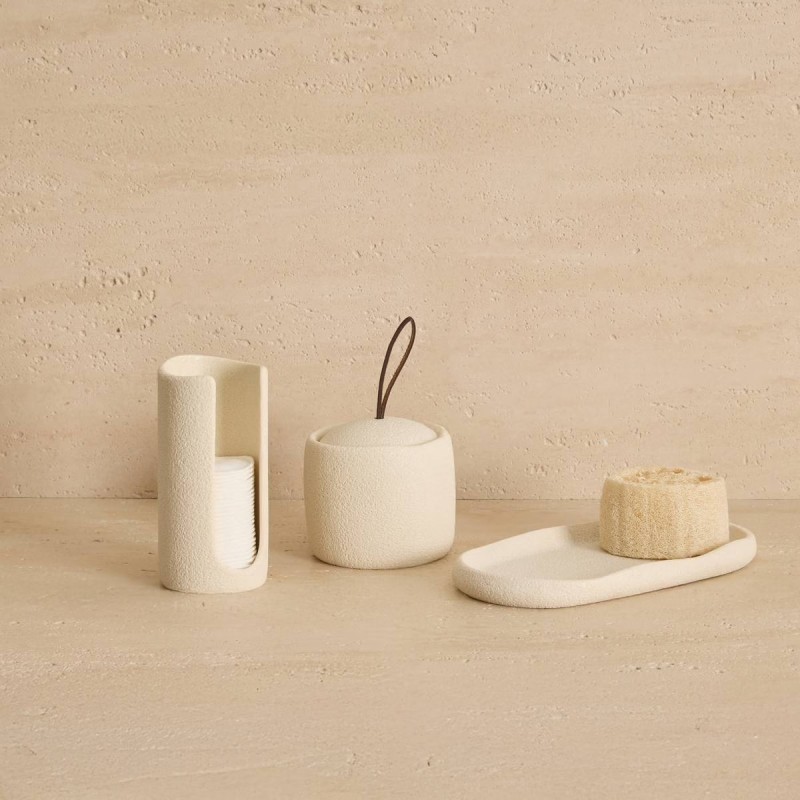 Le pot à cotons OLEYA beige est idéal pour organiser votre salle de bain avec style et praticité.