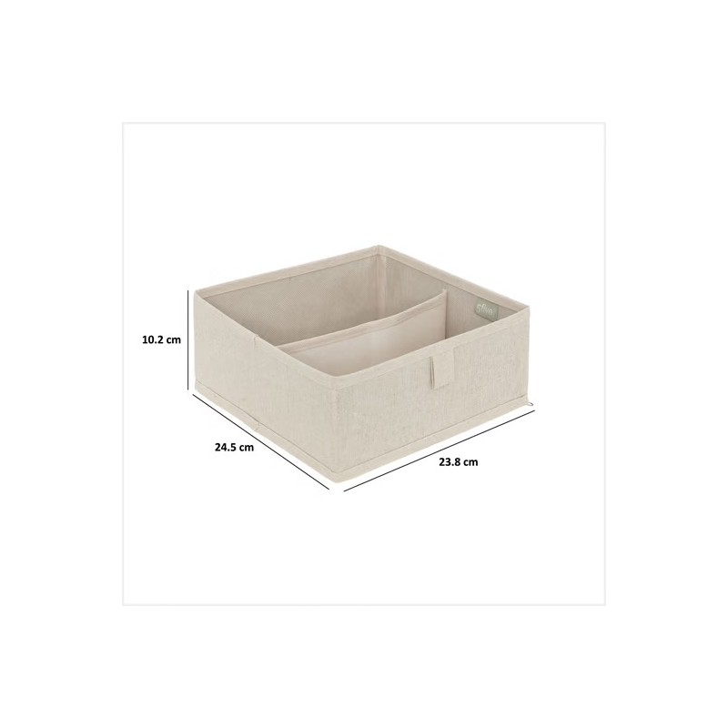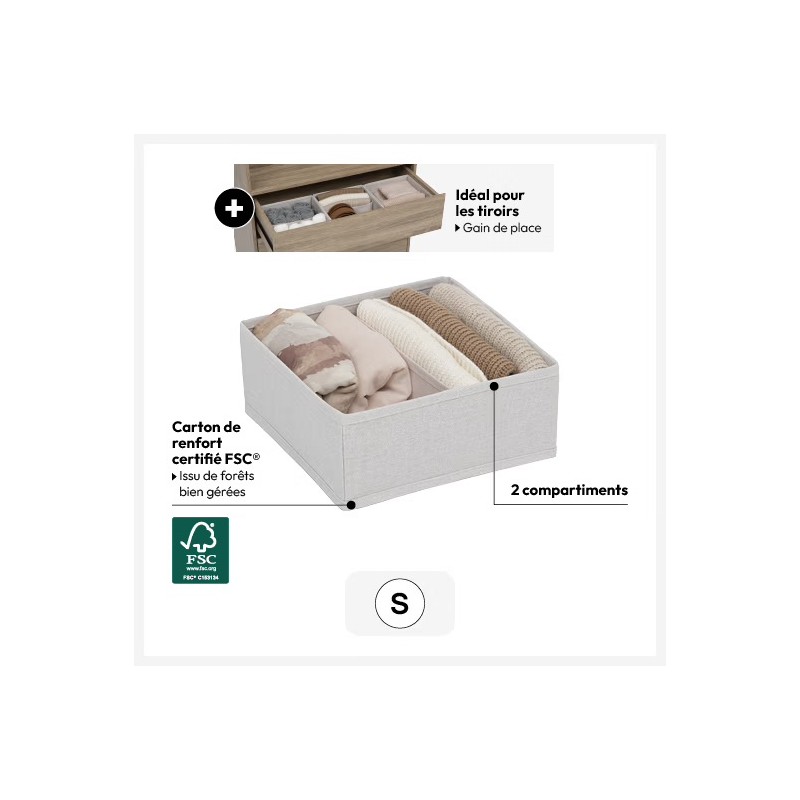 Grâce à ses deux compartiments distincts, chaque article trouve sa place, pour un tiroir toujours ordonné et accessible. Son design sobre s’intègre facilement dans un dressing, une commode ou une armoire, tout en facilitant le rangement au quotidien.