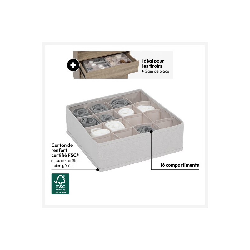Grâce à ses 16 compartiments individuels, chaque article trouve sa place, offrant une visibilité immédiate et un accès rapide au quotidien. Son format pratique s’adapte parfaitement aux tiroirs de commodes, armoires ou dressings, pour un rangement propre, fonctionnel et durable.
