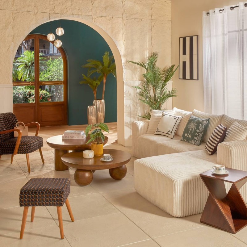 La table ABEKAS s’intègre parfaitement dans un univers naturel, bohème chic ou contemporain minimaliste, notamment associée à un canapé clair ou des matières textiles comme le lin.